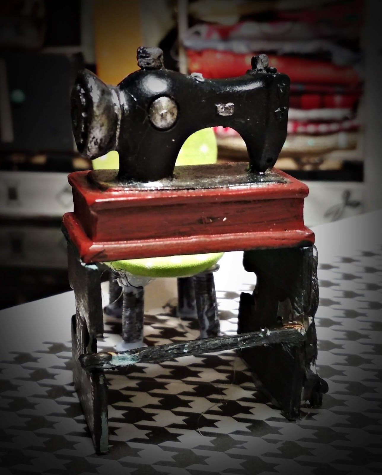 Εν αρχή λοιπόν υπήρχε η ραπτομηχανή,η οποία τοποθετήθηκε πάνω σε κομμάτια πάζλ και στο πλάι κολλήθηκε ένα πλαστικό από παιχνίδι kinder-έκπληξη (δυστυχώς απο την πλευρά που δεν φωτογραφήθηκε)  για να δείχνει σιδερένιο και βάφτηκε μαύρο όπως και τα υπόλοιπα κομμάτια.
